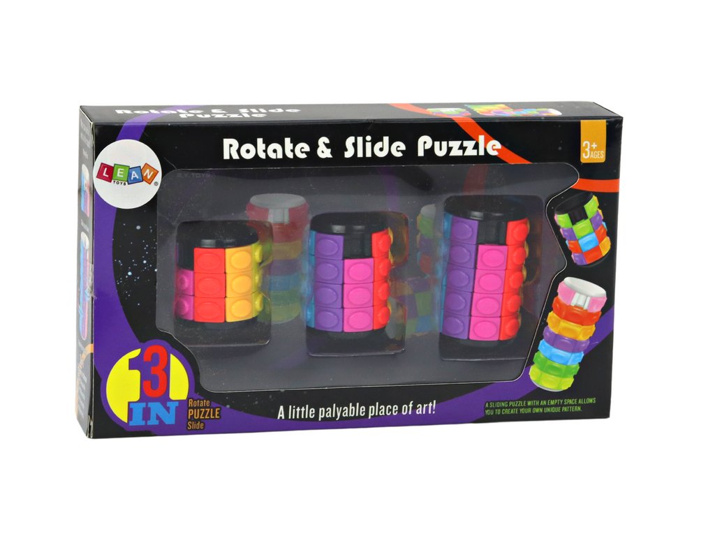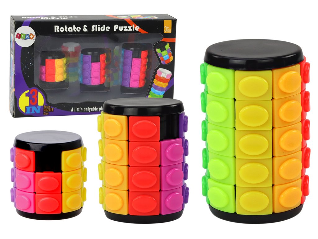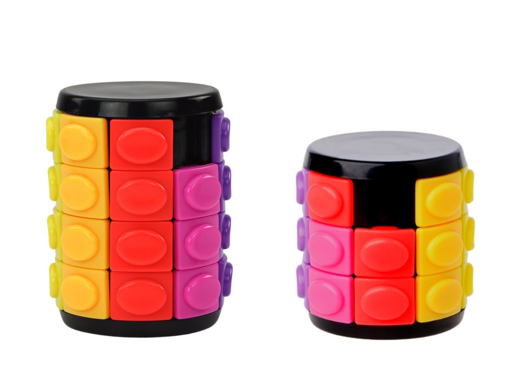 - Naše sada obsahuje neobvyklé hlavolamy ve tvaru válce, kde vaším úkolem bude uspořádat barvy do jedné řady otáčením prstenců a přesouváním barevných kostek