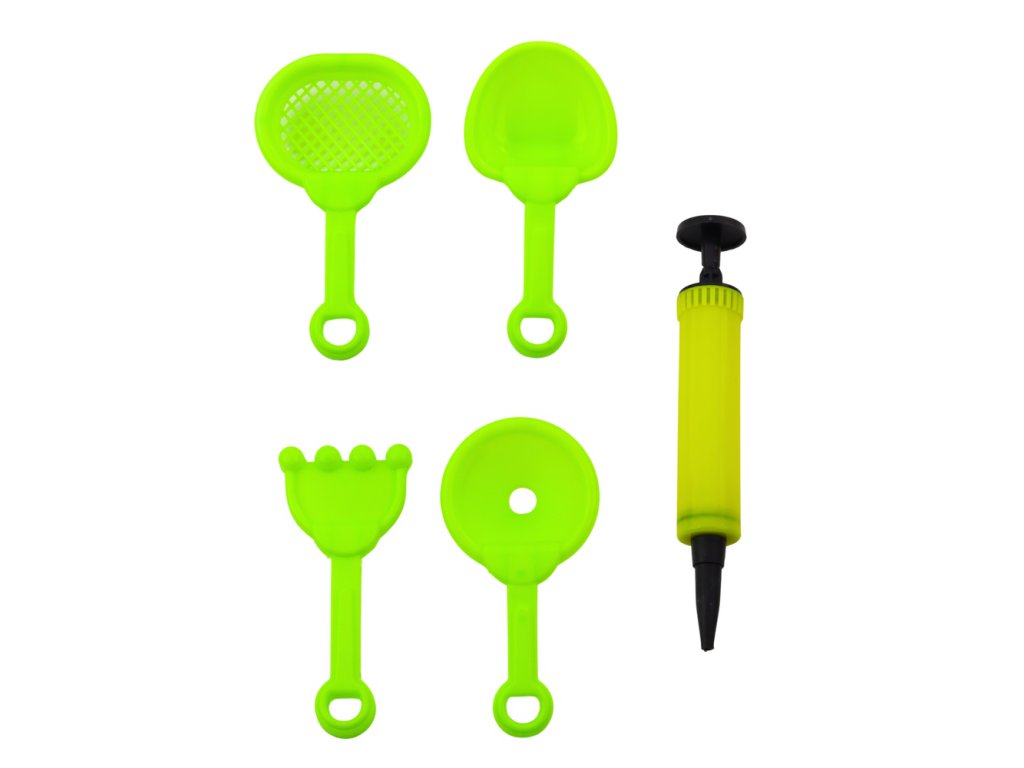 - 7 praktických nástrojů pro formování, pompku a nafukovací desku, která slouží jako mobilní pískoviště