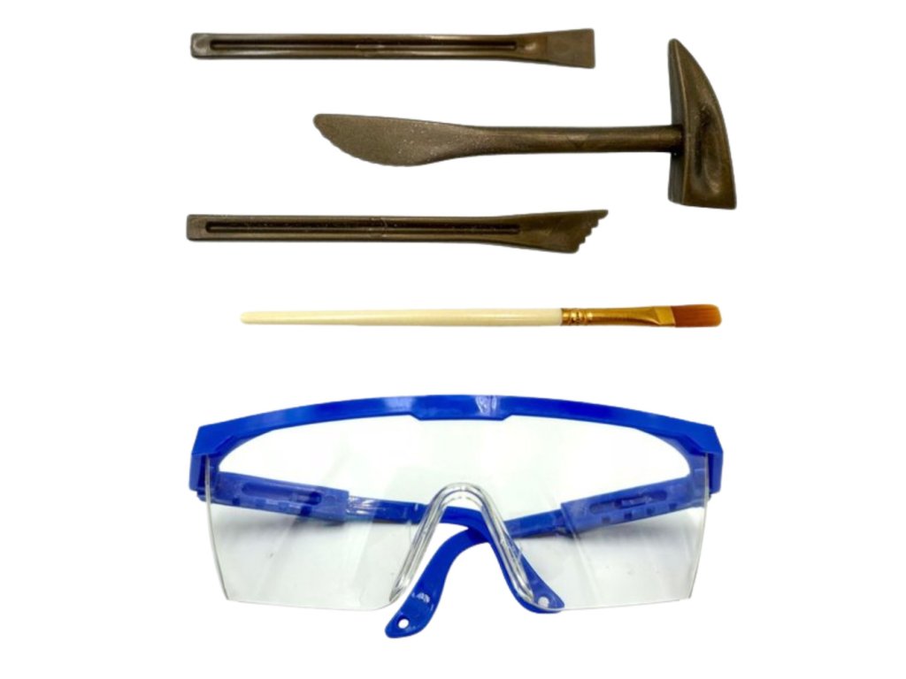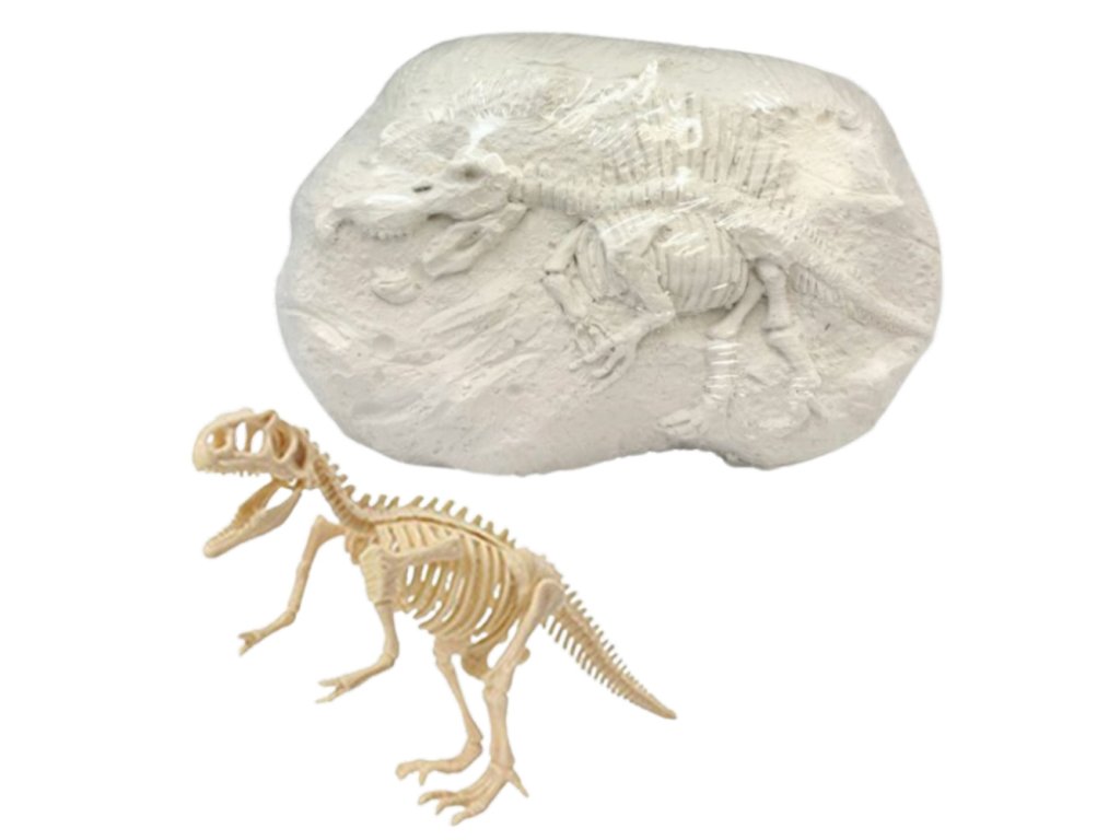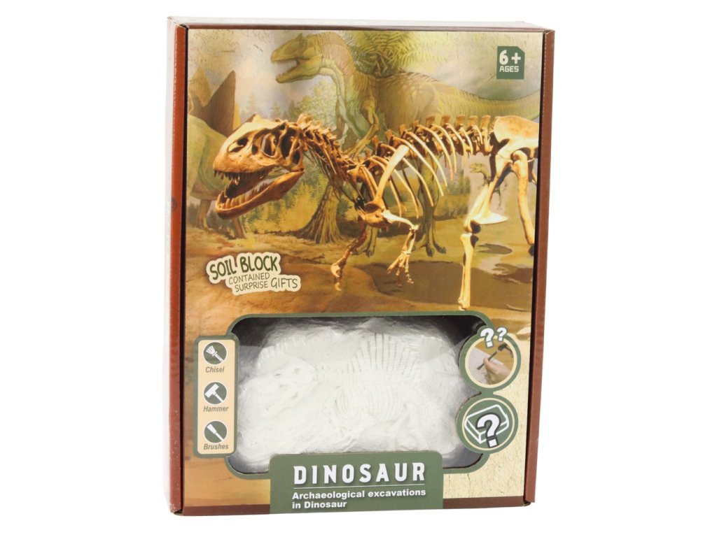 - Obsah: Gipsový blok, skrytý dinosauří skelet (náhodně 1 z 8), kladívko, dlátka, štěteček, ochranné brýle