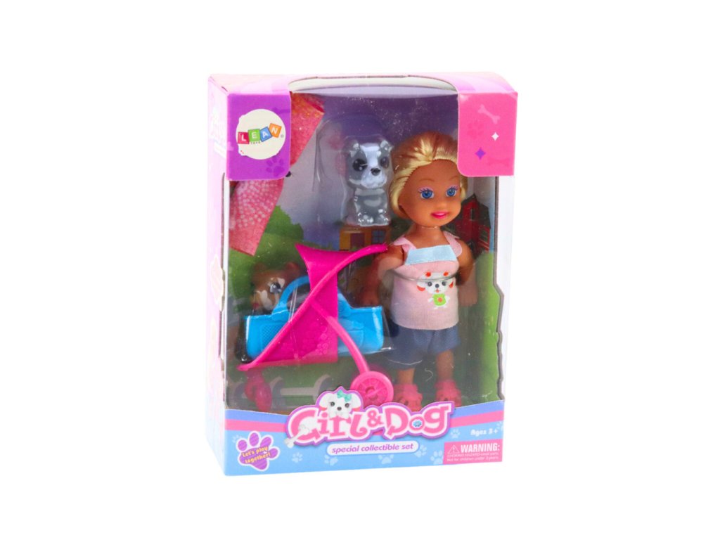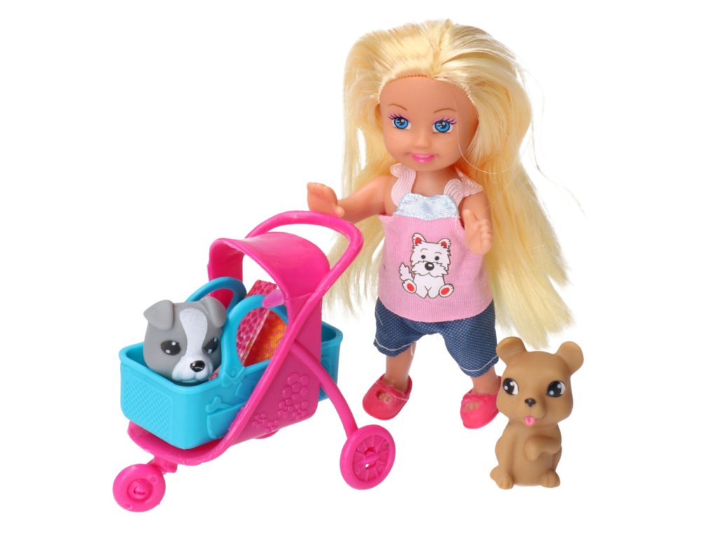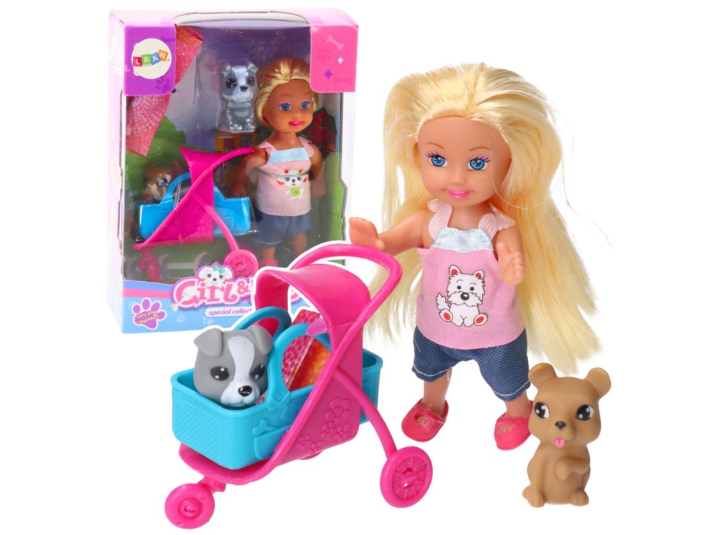Sada mini panenka s kočárkem a pejsky je dokonalou nabídkou pro děti, které milují hru na péči o zvířátka Mini panenka s dlouhými blond vlasy doprovází své dva roztomilé pejsky, bere je na procházku v pestrobarevném kočárku nebo je nosí ve speciálním nosítku