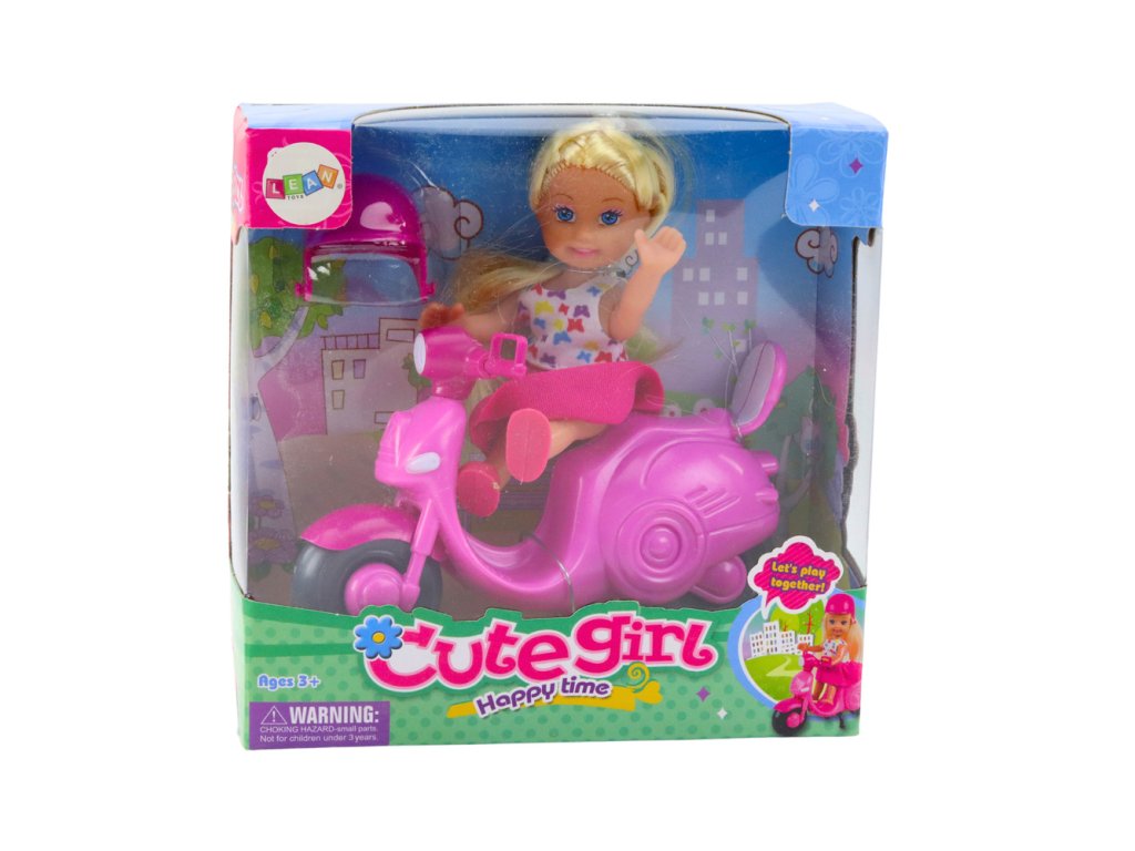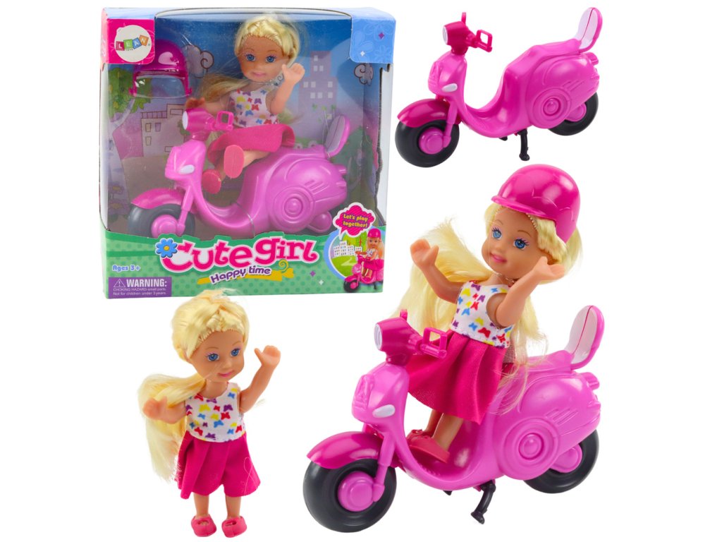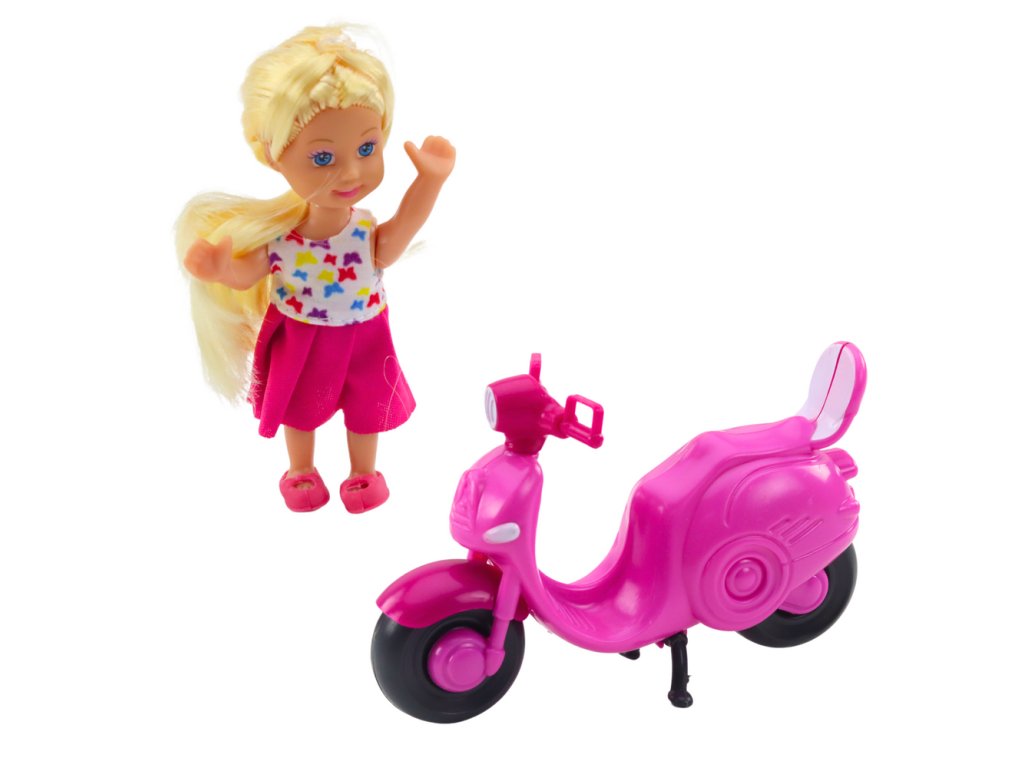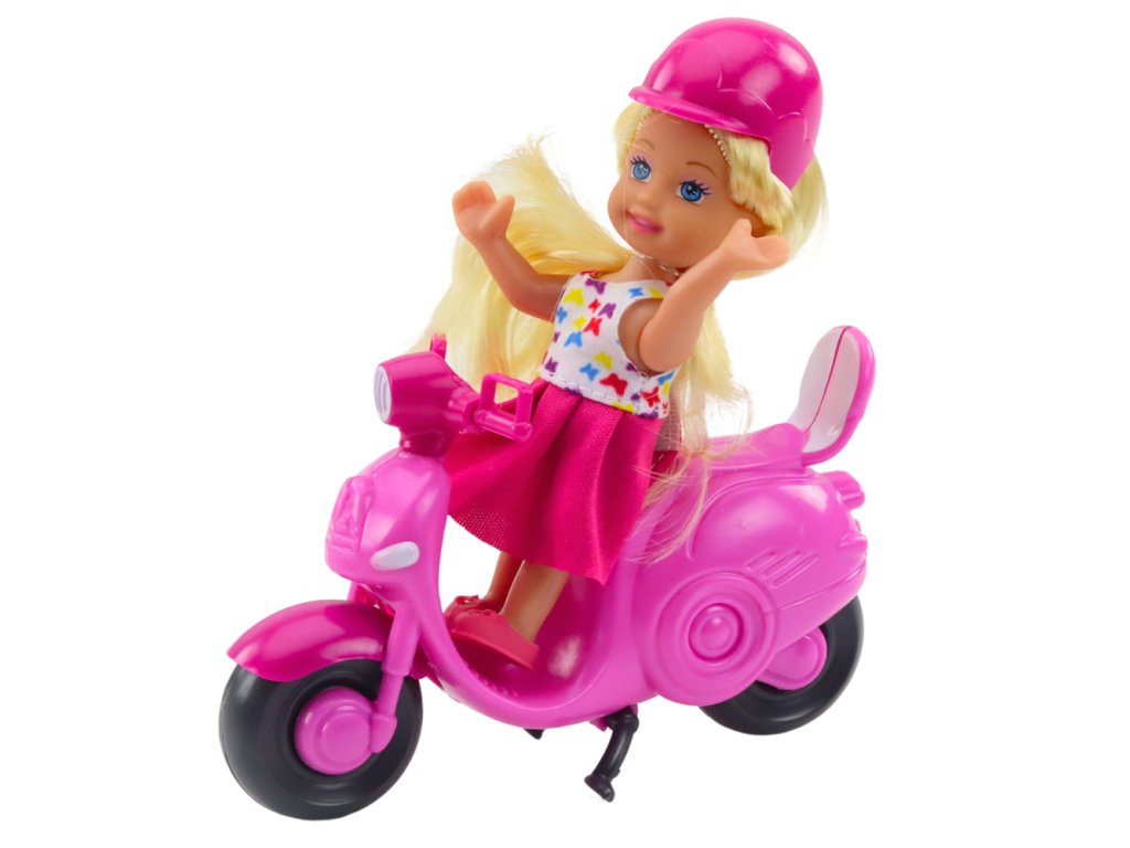 Díky krásné panence v barevných šatech a stylovému, růžovému skútru může dítě vytvářet nespočet herních scénářů, rozvíjet představivost a kreativitu Panenka vysoká 11 cm má dlouhé blond vlasy a roztomilý obleček, zatímco skútr vyrobený z odolného plastu je vybaven pohyblivými koly a zrcátky