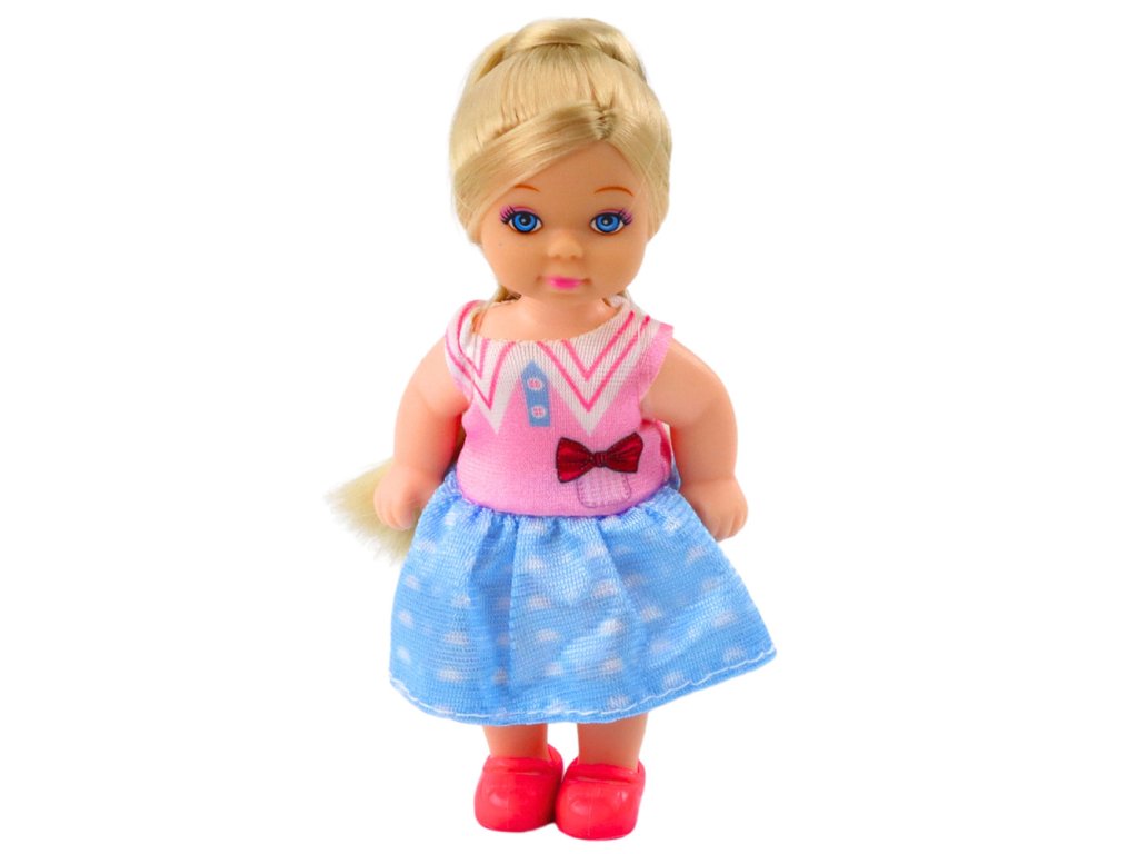 V sadě naleznete panenku vysokou 12 cm, oblečenou ve stylové, dvoubarevné sukni vršek je v růžovém tónu s potiskem mašličky a límečku, spodní část je v modré barvě s jemným bílým vzorem