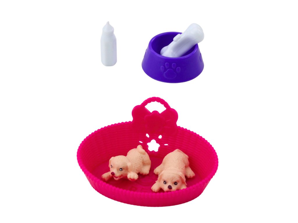 Sada Mini Panenka Se Dvěma Štěňátky Pelíšek Miska Láhev
