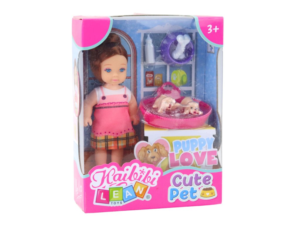 Stylizaci doplňují růžové botičky a tmavé vlasy svázané do culíku, které dodávají postavičce přirozený půvab Největší atrakcí setu jsou dvě malé štěňátka, které lze krmit, ošetřovat a ukládat ke spánku v přiloženém růžovém pelíšku s motivem tlapky