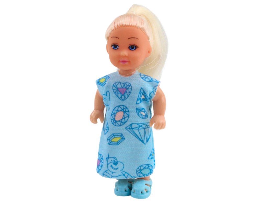 - Panenka o výšce 12 cm je oblečená v modrých šatech s roztomilými potisky a součástí sady jsou tematické doplňky