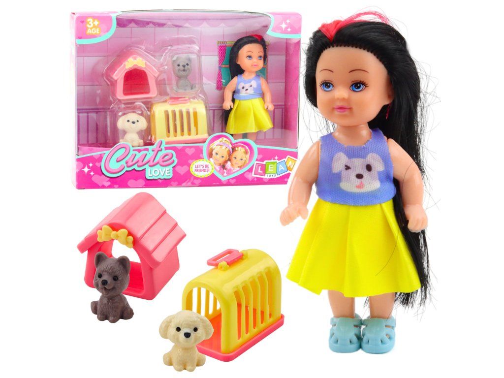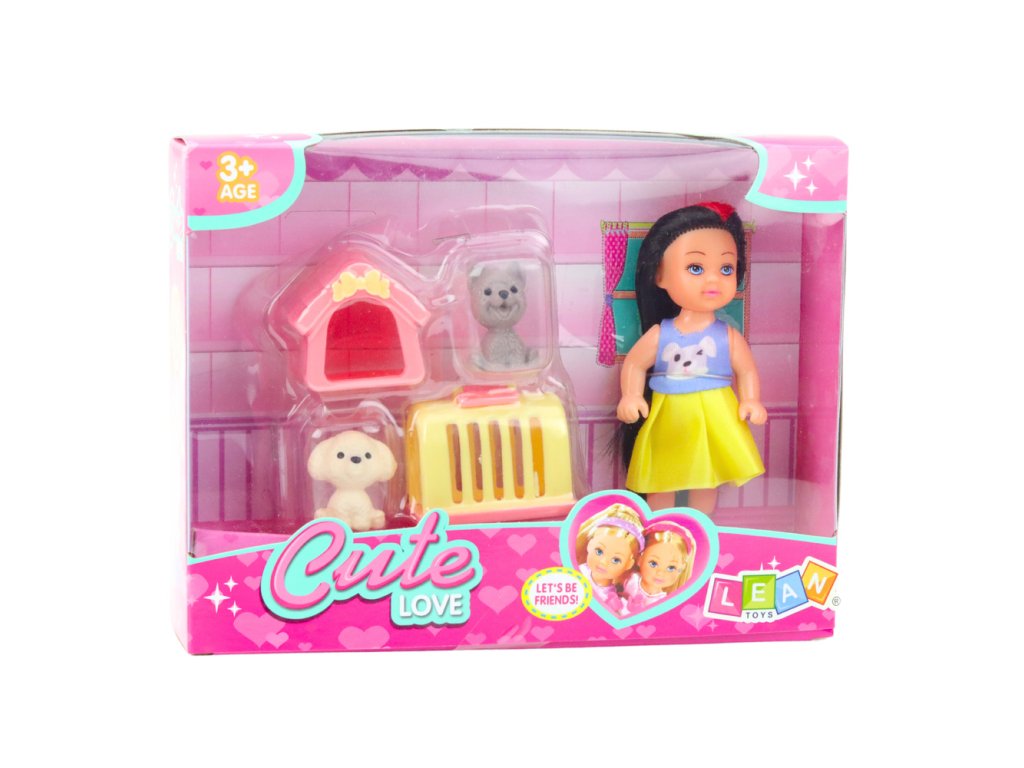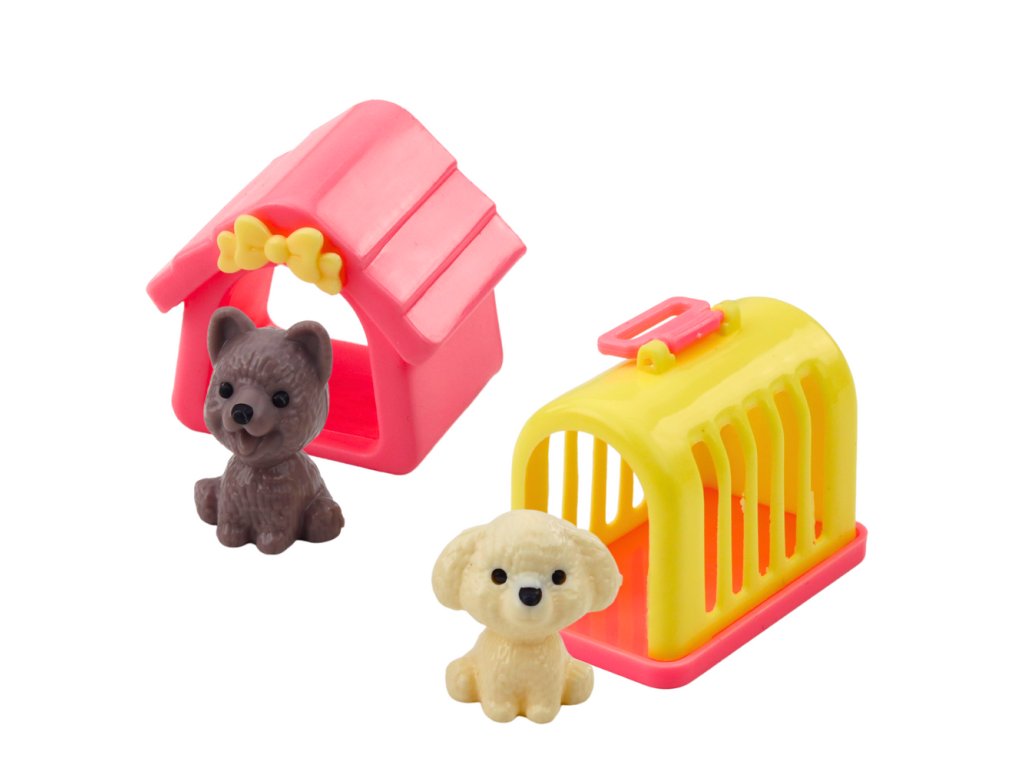 V sadě je panenka o výšce 12 cm, oblečená v pestrobarevných šatech s potiskem sympatického pejska, a také dva roztomilí štěňátka jeden z nich bydlí v barevné boudě, druhý cestuje v žluto-růžové přepravce