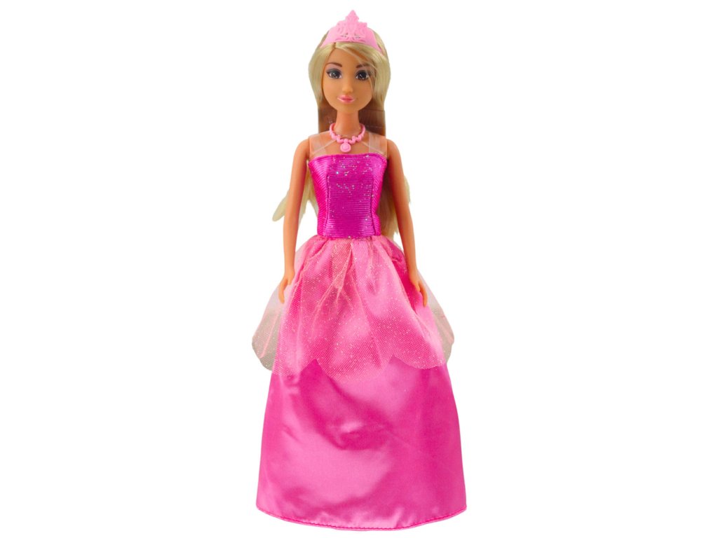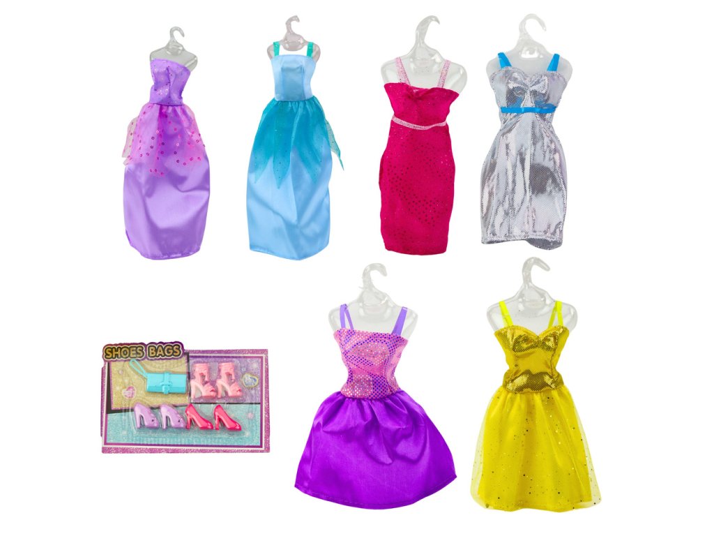 - W komplecie znajduje się elegancka lalka w długiej balowej sukni, ozdobiona połyskującym materiałem oraz koroną, a także 7 dodatkowych sukienek w różnorodnych fasonach i kolorach