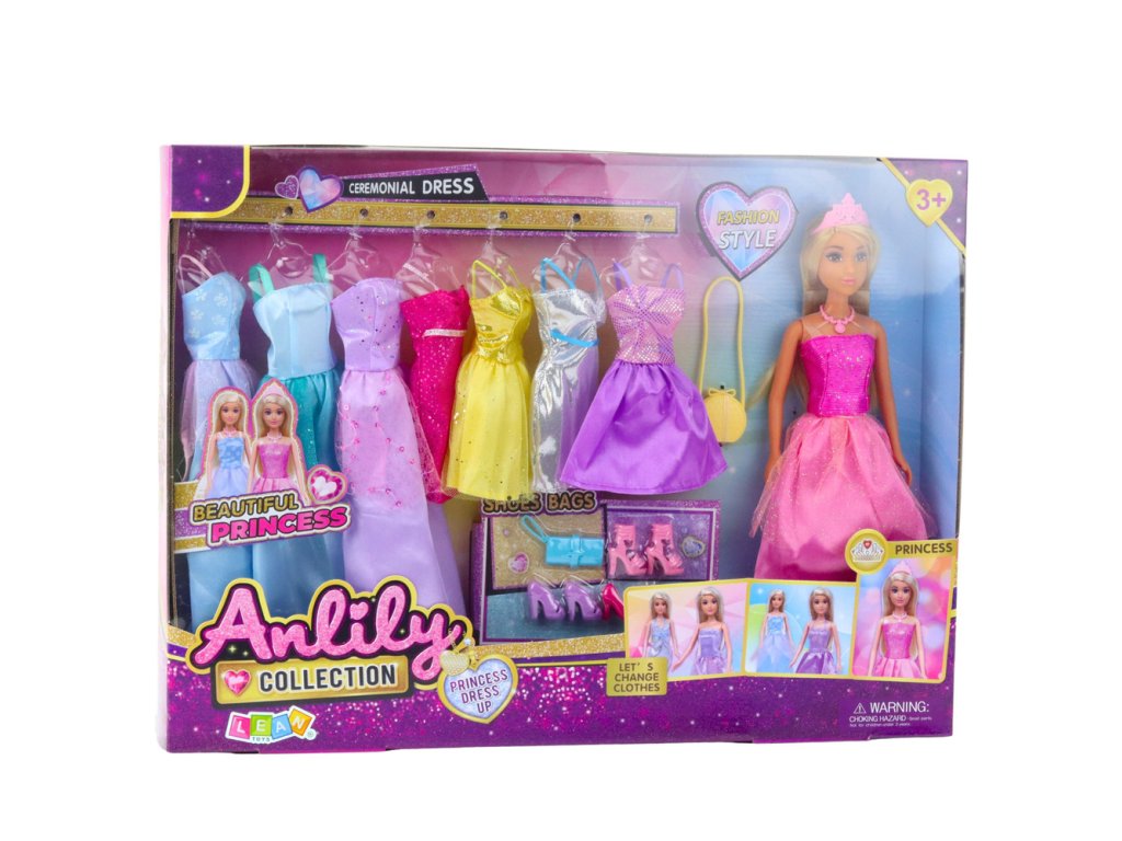 LALKA ANLILY Z KOLEKCJĄ 8 SUKIENEK BUTAMI I TOREBKAMI Lalka Anlily z kolekcją sukienek i dodatków to doskonały zestaw dla dzieci, które uwielbiają modę, kreatywną zabawę i stylowe przebieranki