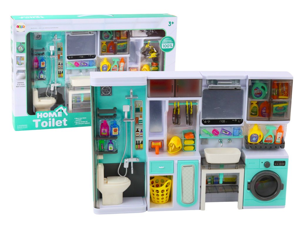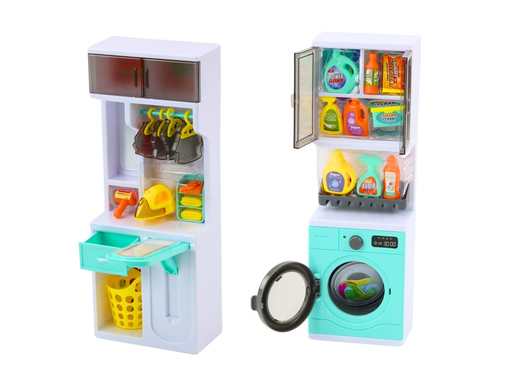 - Pračka s skříňkou: Obsahuje sympatickou pračku s pohyblivými prvky a skříňku na detergenty a ručníky, pomáhá naučit děti o praní a organizaci oblečení