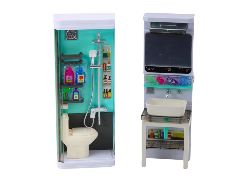 Sprcha a záchod: Sprcha s toaletou je realisticky provedená s průhlednými dveřmi a malou toaletou s pohyblivým víkem, ideální pro hraní scén z každodenních hygienických rituálů Umyvadlo se zrcadlem: Stylově navržené s vestavěným zrcadlem a poličkou na toaletní potřeby, učí děti péči o čistotu a pořádek v koupelně