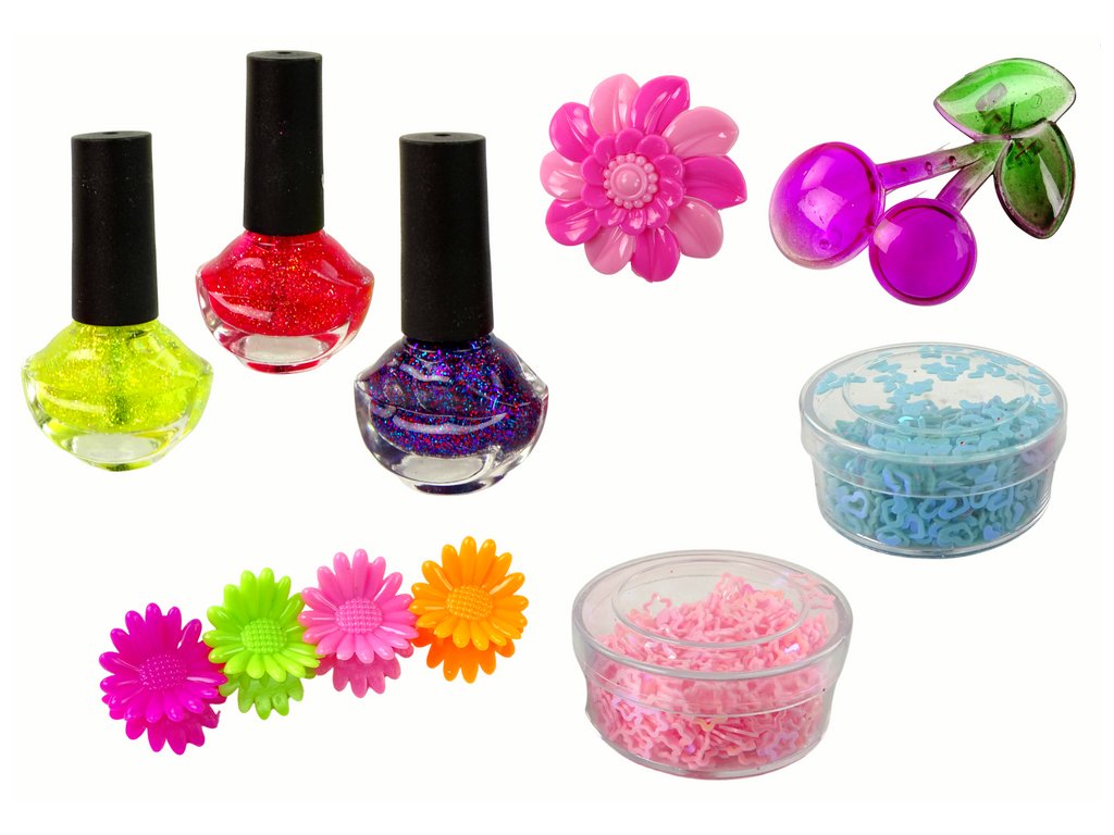 - V sadě najdete tři laky na nehty v odstínech fialové, červené a žluté, abyste si mohli nehty ozdobit podle svého vkusu