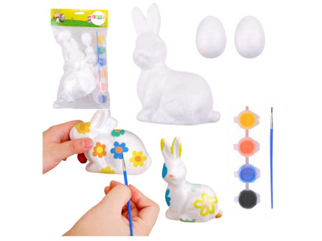 V sadě se nachází jeden polystyrenový zajíc a dvě polystyrenová vajíčka Dále jsou přiloženy barvy ve čtyřech intenzivních odstínech a štětec, které umožňují snadné a přesné malování