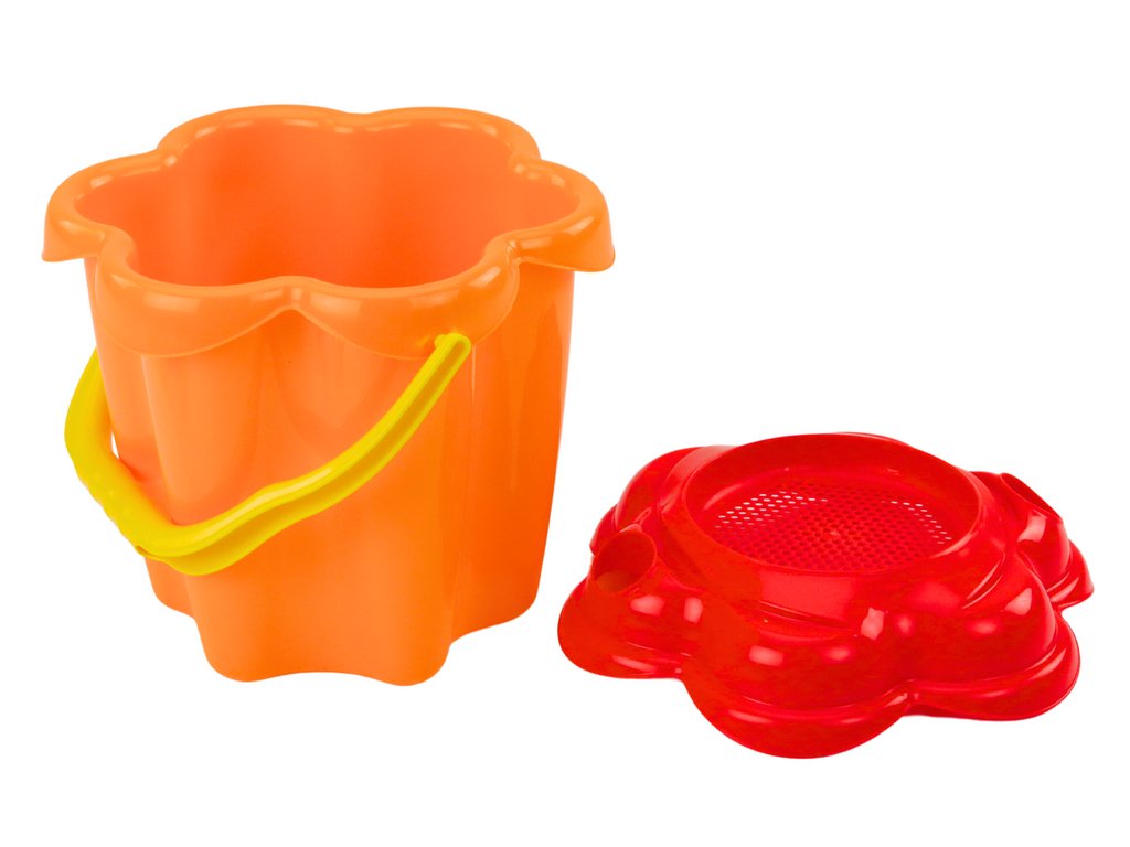 - Kbelík s víkem ve tvaru květiny slouží jako ideální nástroj pro přepravu písku i jako sítko pro zajímavé textury a vzory