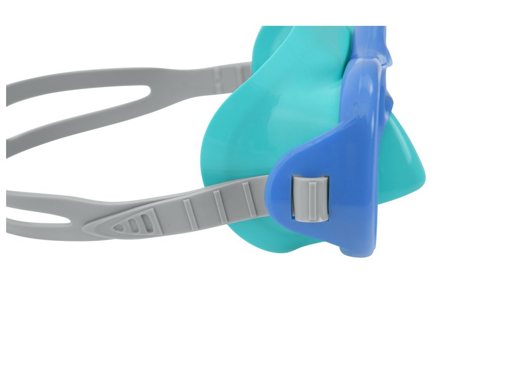 - Díky nastavitelnému pásku se maska perfektně přizpůsobí hlavě dítěte, zatímco technologie "suché šnorchly" zajišťuje, že voda zůstane venku, a tím zabraňuje náhodnému vdechnutí vody