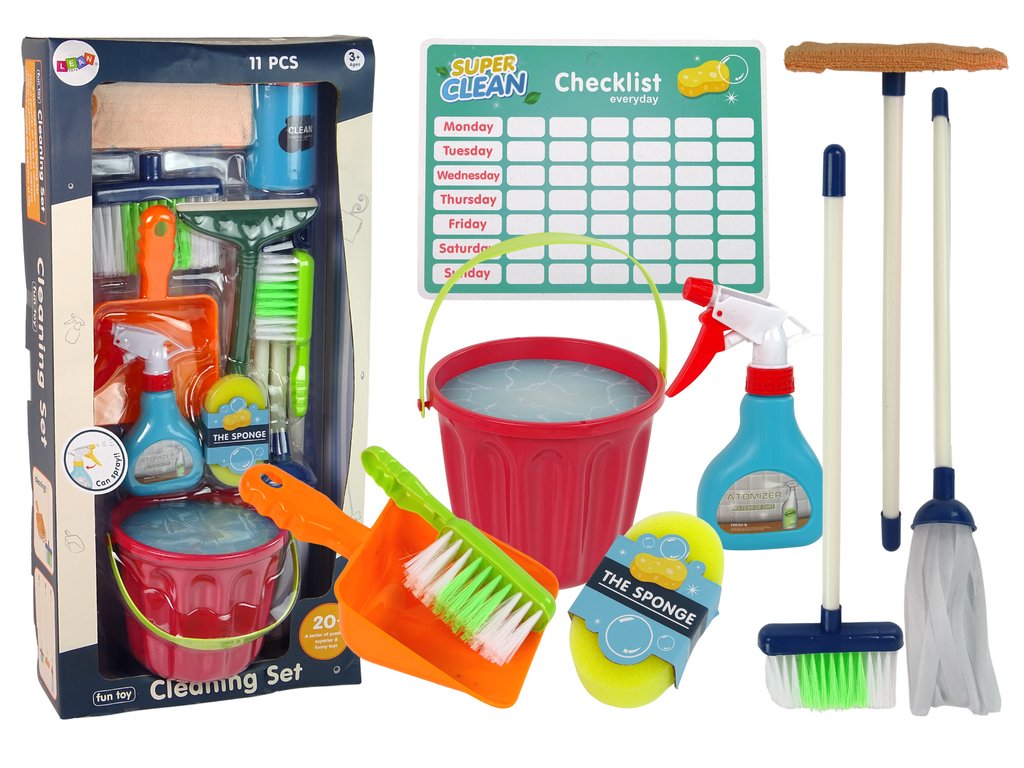 Čisticí sada 11v1 pro děti Cleaning Set Bohatě vybavená úklidová sada 11v1 je skvělou volbou pro děti od 3 let Sada obsahuje: smeták na dlouhé násadě, páskový mop a plochý mop, kbelík, lopatku s lopatkou, balení čisticího prášku (imitace), láhev s rozprašovačem, houbu, stěrku na okna, plán úklidu, kartonovou louži