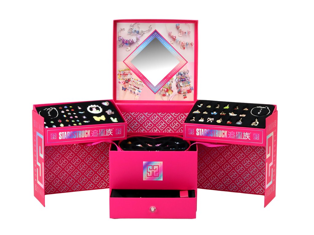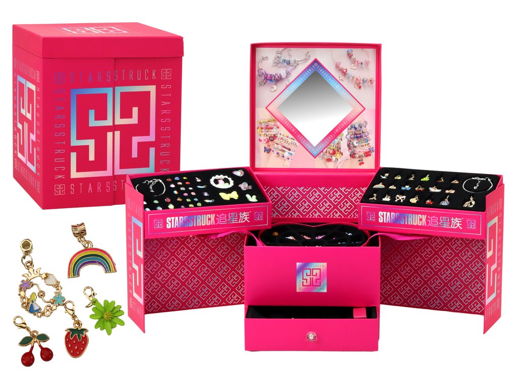 Tato jedinečná sada, zabalená ve velké čtvercové růžové krabičce o působivých rozměrech 26 cm x 23 cm x 23 cm, potěší každého malého umělce Po otevření krabičky se její stěny rozsunou a odhalí tři velké police, z nichž každá je naplněna barevnými poklady pro výrobu šperků