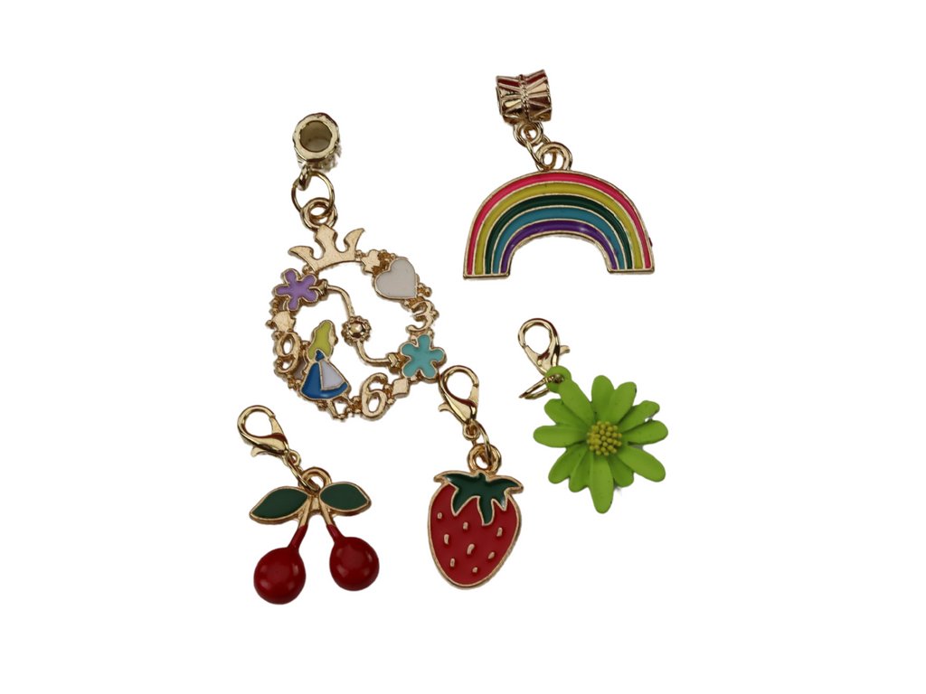 - Na první polici najdete barevné přívěsky ve tvaru motýlů, květinek a hvězdiček, které vybízejí k kreativnímu kombinování a vytváření jedinečných kompozic