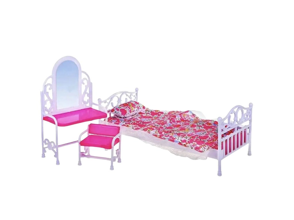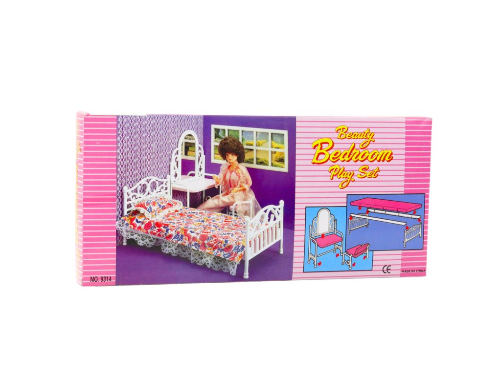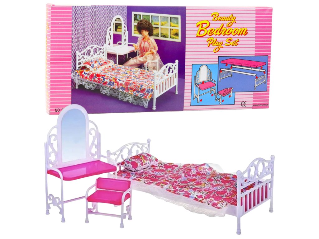 - Sada nábytku pro panenky postel toaletní stolek židle povlečení s květinami je perfektním doplňkem pro každou dívku, která si ráda hraje s panenkami
