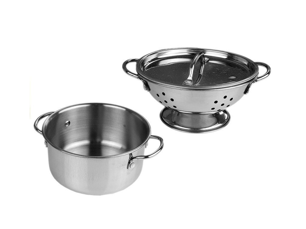 - Námi nabízená sada se skládá z lesklého, kovového, stříbrného nádobí, které zahrnuje mimo jiné hrnec, pánve a cedník