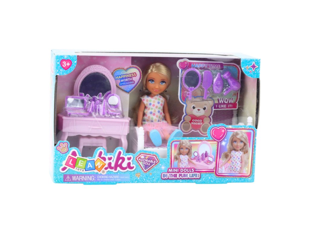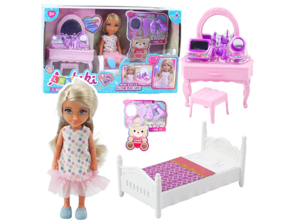 - Sada obsahuje panenku o výšce cca 13 cm, stylovou toaletku se zrcadlem a příslušenstvím, pohodlnou postýlku s ložním prádlem a další prvky, které umožňují hrát nekonečné scénky