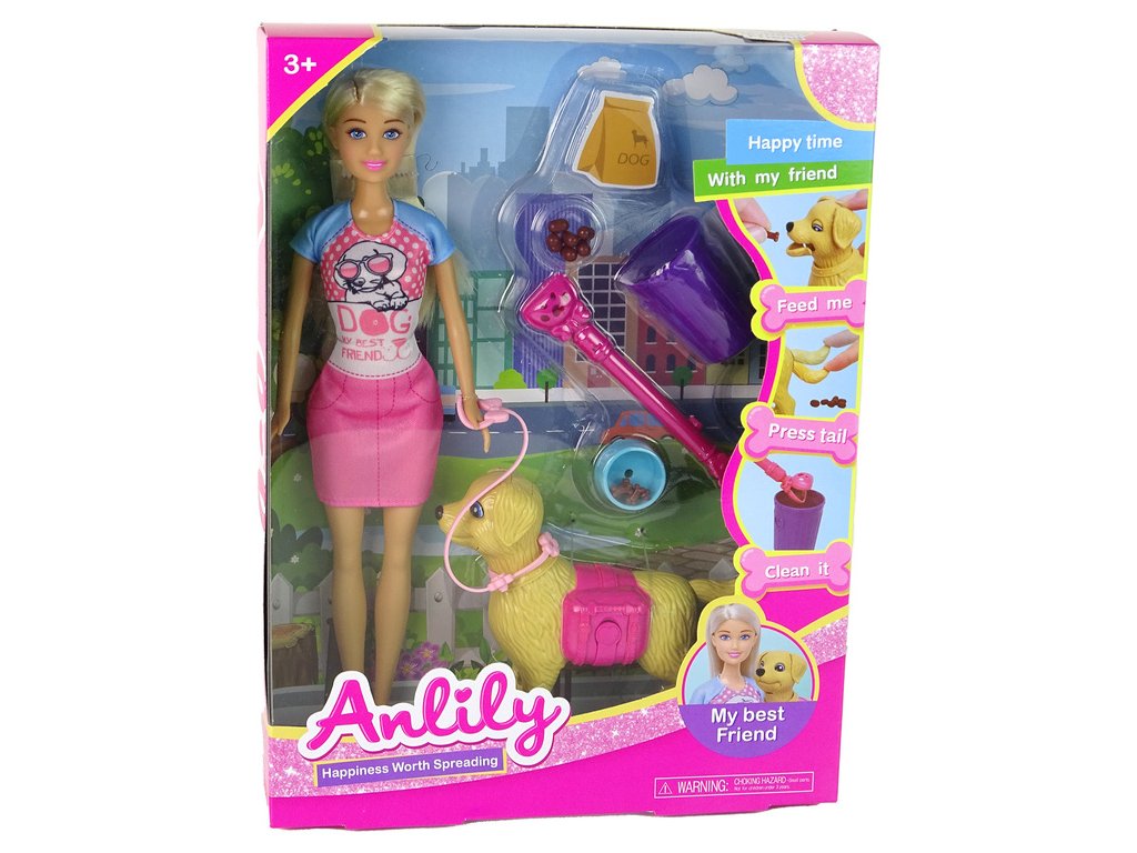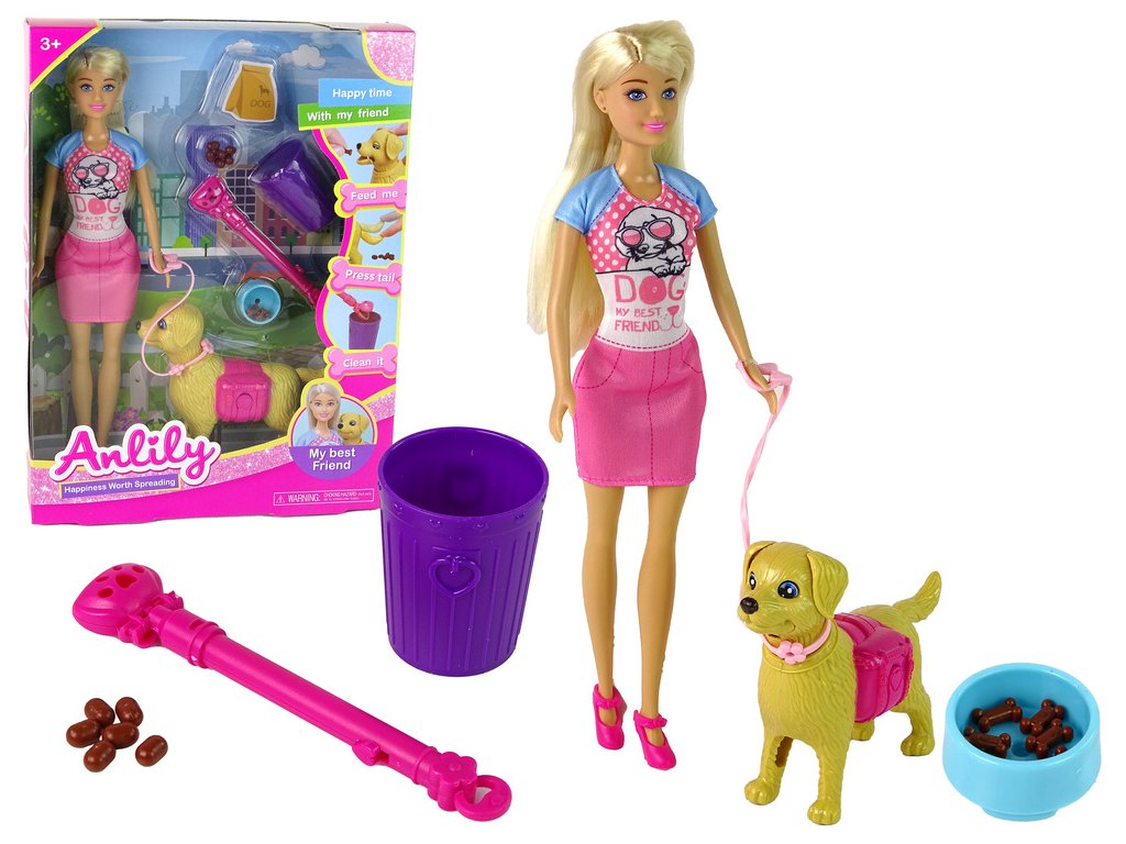 Sada panenka se psem a krmivem Prezentovaná sada je ideální volbou pro malé milovnice domácích mazlíčků Hra naučí zodpovědnosti spojené s chovem zvířete v domácnosti a plněním souvisejících povinností, jako je venčení, krmení a úklid