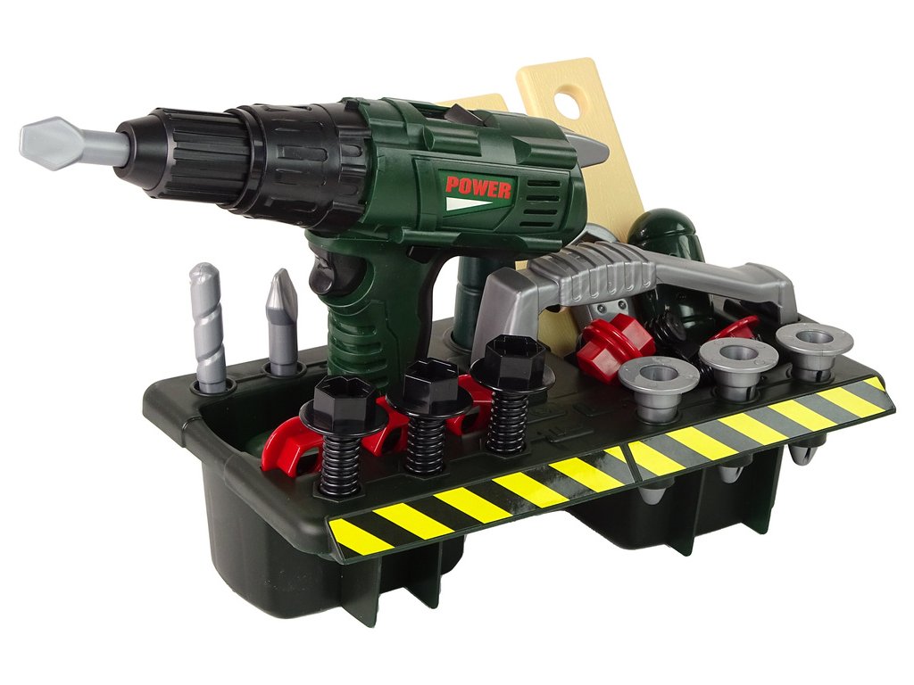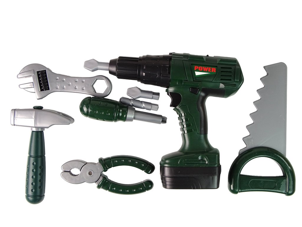 - Pokud váš malý kutil je fascinován šroubováním, upoutá ho realistická vrtačka napájená dvěma bateriemi 1,5 V AA, která po stisknutí tlačítka vydává realistický zvuk a pohyb