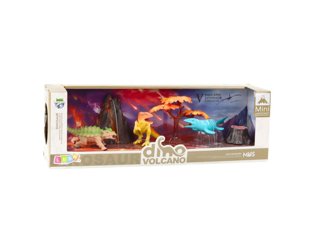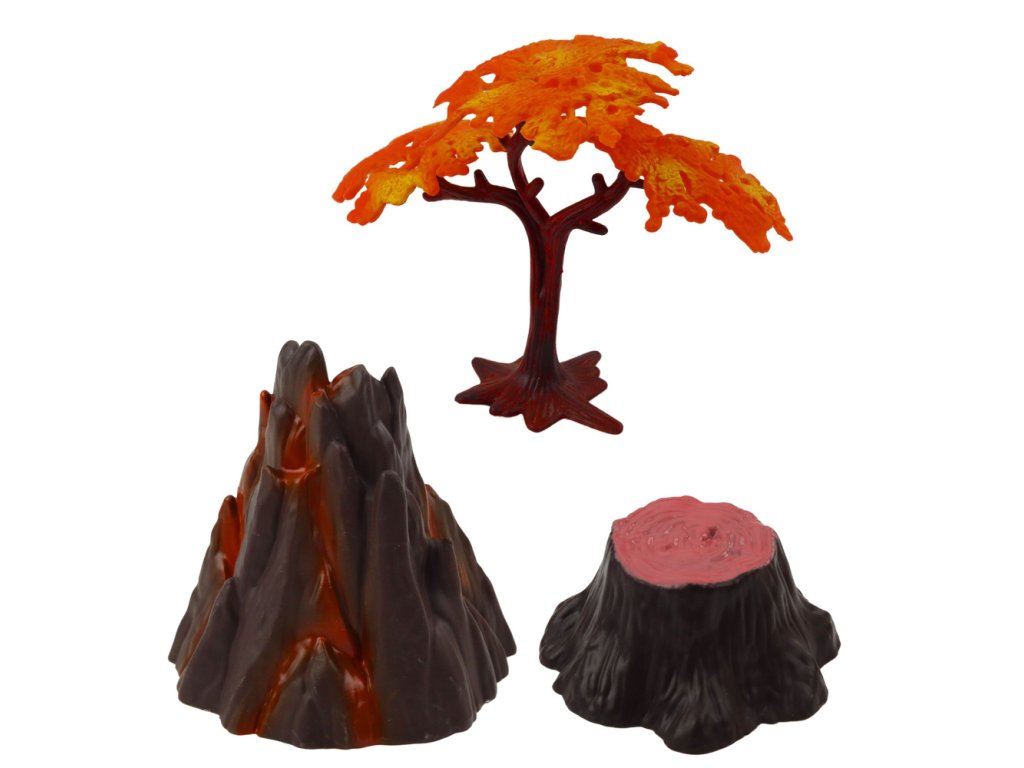 - Sada obsahuje 3 figurky dinosaurů, sopku, pařez a barevný strom, který dodává atmosféru dávnověku