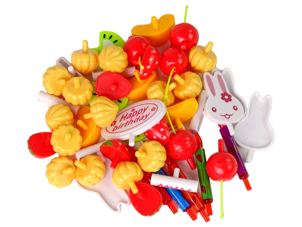 - Dítě může dort „krájet“ pomocí speciálního plastového nože a poté ho libovolně zdobit svíčkami, ozdobami a ovocem