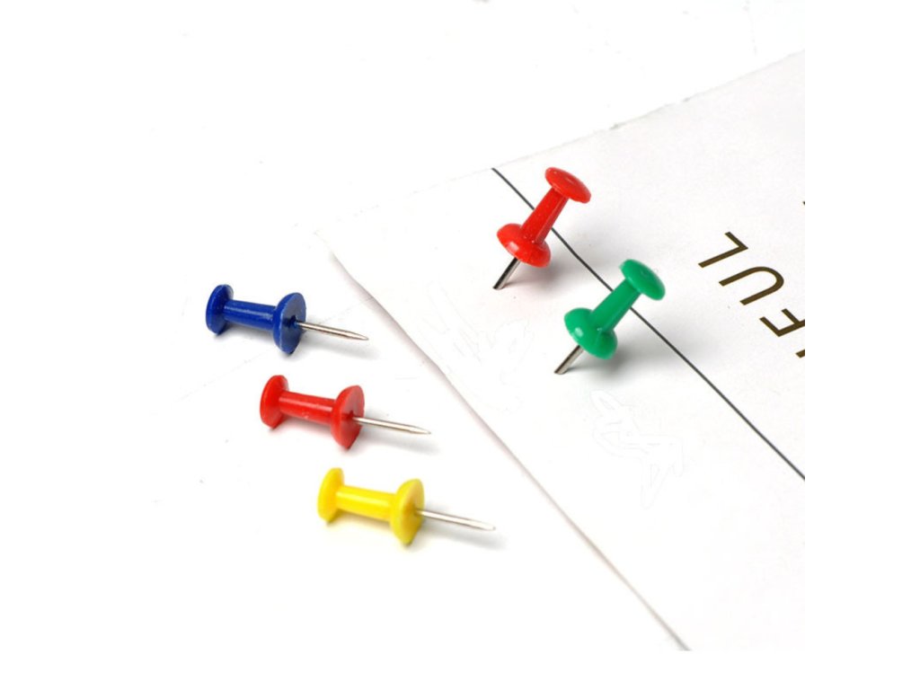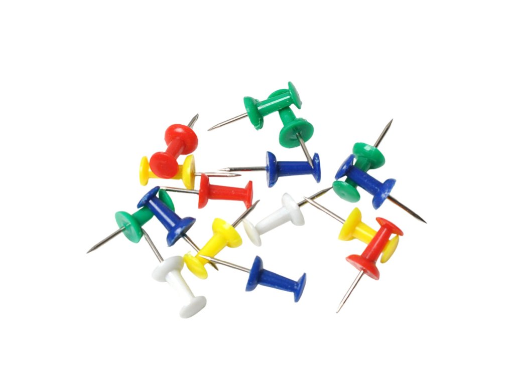 - Barevné kancelářské špendlíky jsou praktickým doplňkem k korkovým a textilním tabulím, umožňují připnutí poznámek, fotografií, plánů či oznámení