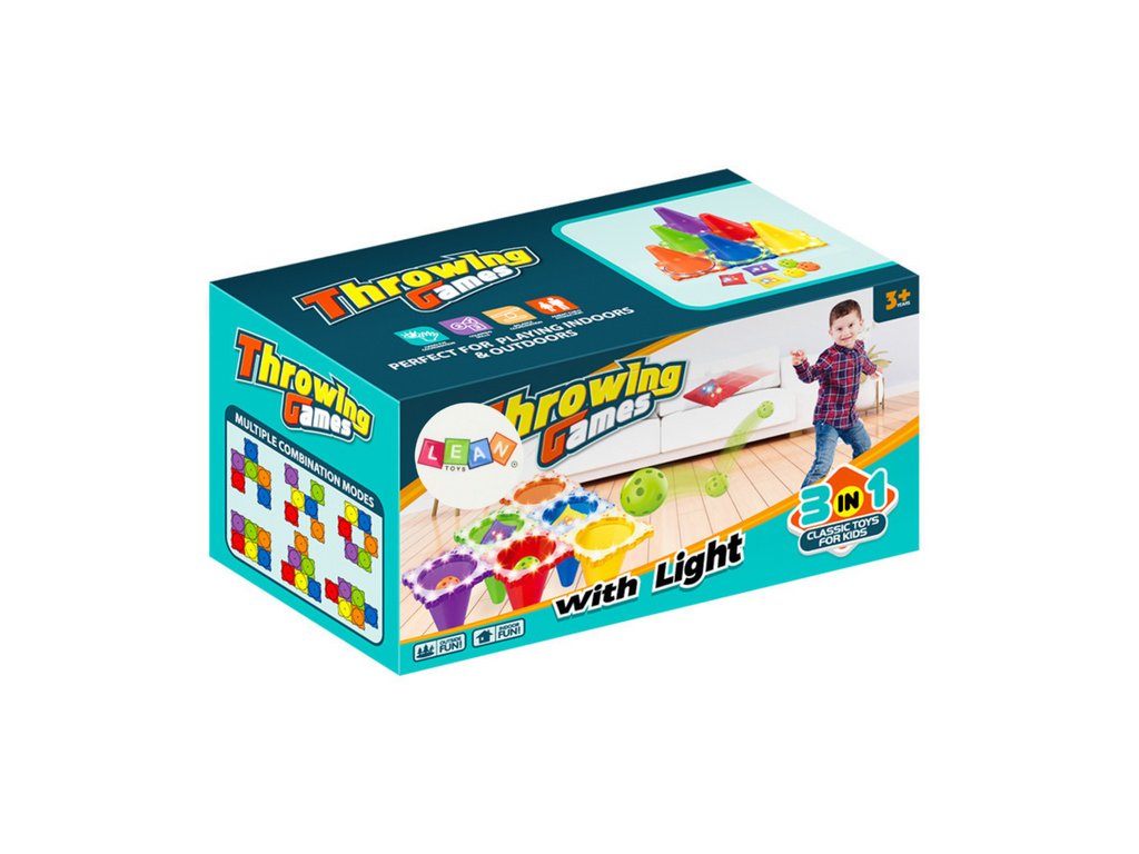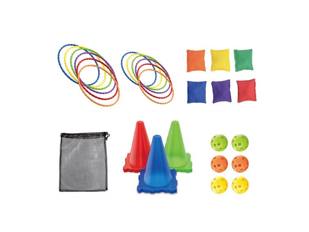 - Obsahuje kužely, které slouží jako cíl, a tři různé předměty k házení: obruče, pytlíky a míčky