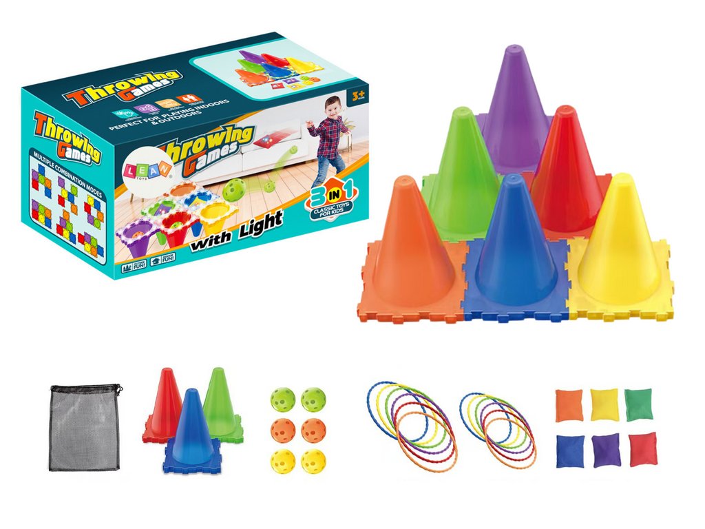 Sada sportovních dovednostních her Házení na cíl 3v1 je všestranná sada, která přináší spoustu aktivní a kreativní zábavy jak doma, tak na zahradě Obsahuje kužely, které slouží jako cíl, a tři různé předměty k házení: obruče, pytlíky a míčky