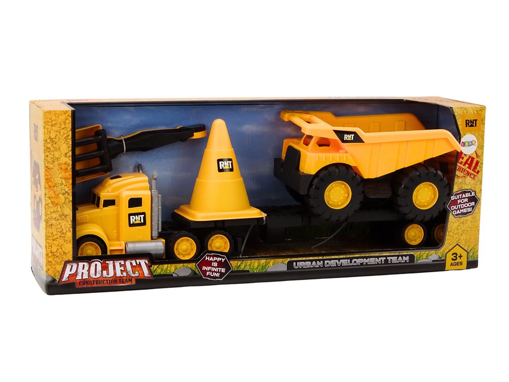 - Sada obsahuje žlutý nákladní vůz s odtahovkou, sklápěč, velký žlutý kužel a lopatu s hráběmi, které zajistí hodiny nekonečné zábavy doma i venku