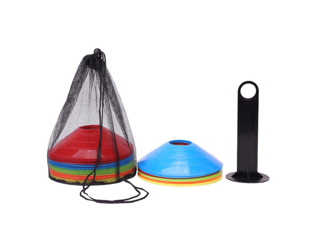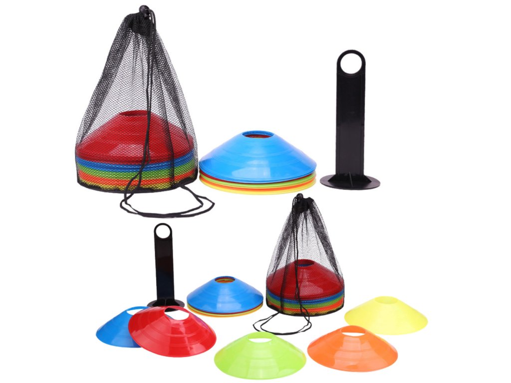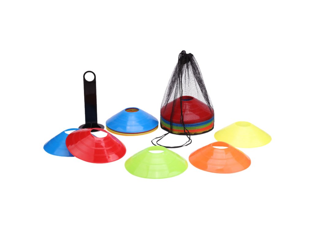 Profesionální sada 50 tréninkových kuželů je nezbytným příslušenstvím pro sportovní, rekreační a rehabilitační trénink V balení se nachází kužely v pěti intenzivních barvách, pevný stojan pro uložení a síťový vak usnadňující organizaci a transport celé sady