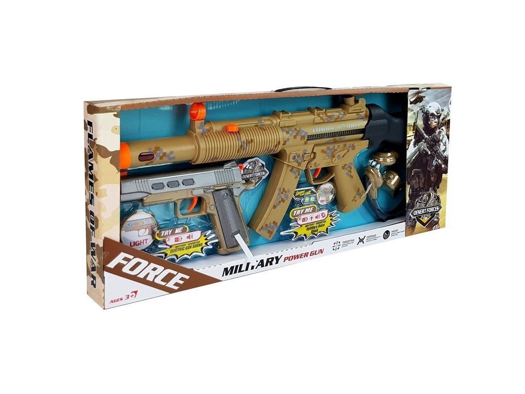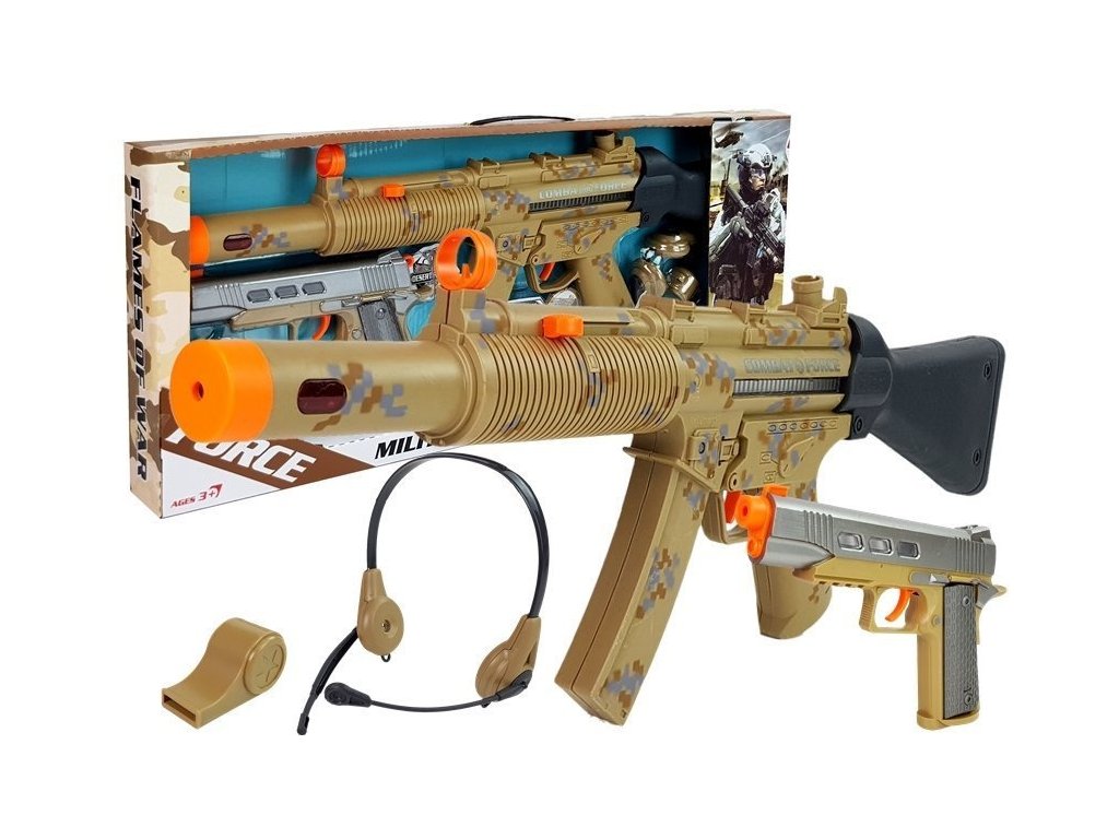 - Vojenská sada zbraní Dvě pistole Píšťalka Vojenské hračky a vojenské doplňky jsou obvykle figurky vojáků napodobující bojiště nebo pistole na kuličky