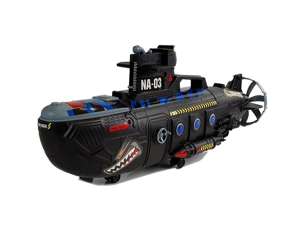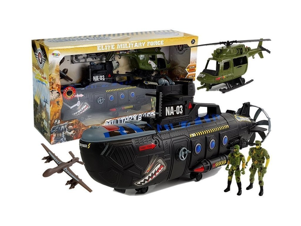 Představujeme obrovskou vojenskou ponorku s helikoptérou pro děti, které milují hrát si na vojáky, vždy je fascinovaly filmy s vojáky a také je zajímá mořský život. Sada rozvíjí představivost a kreativitu, nyní můžete uspořádat velkou námořní bitvu, ale také řídit situaci ze vzduchu díky přiložené helikoptéře. Celá sada je v vojenských barvách, obsahuje také dvě figurky vojáků vypracované do nejmenšího detailu. V rukou mají otvory, které umožňují vložení zbraní, jež jsou součástí sady. Nahoře ponorky je tlačítko, které aktivuje zvukové efekty, uslyšíte zvuky střelby, teď můžete potápět další lodě na svém moři. Ponorka má namontovaná kolečka, což umožňuje její pohyb.