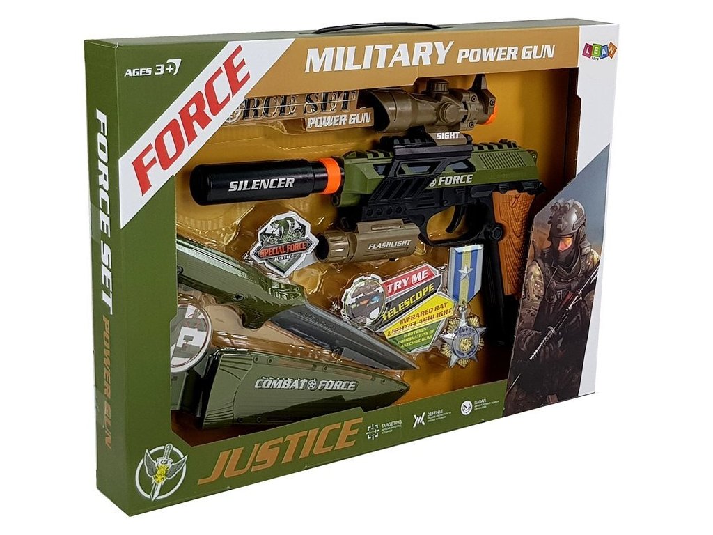 - Vojenská sada pistole, puška, nůž, medaile, zaměřovač Vojenské hračky a vojenské doplňky jsou obvykle figurky vojáků napodobující bojiště nebo pistole na kuličky