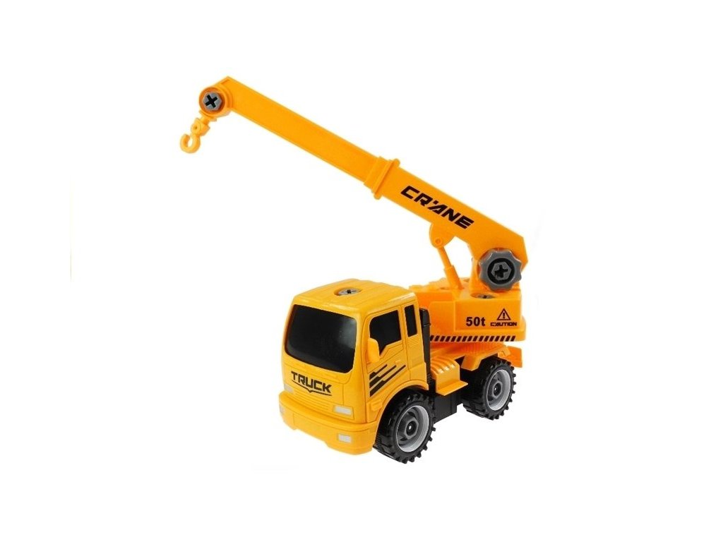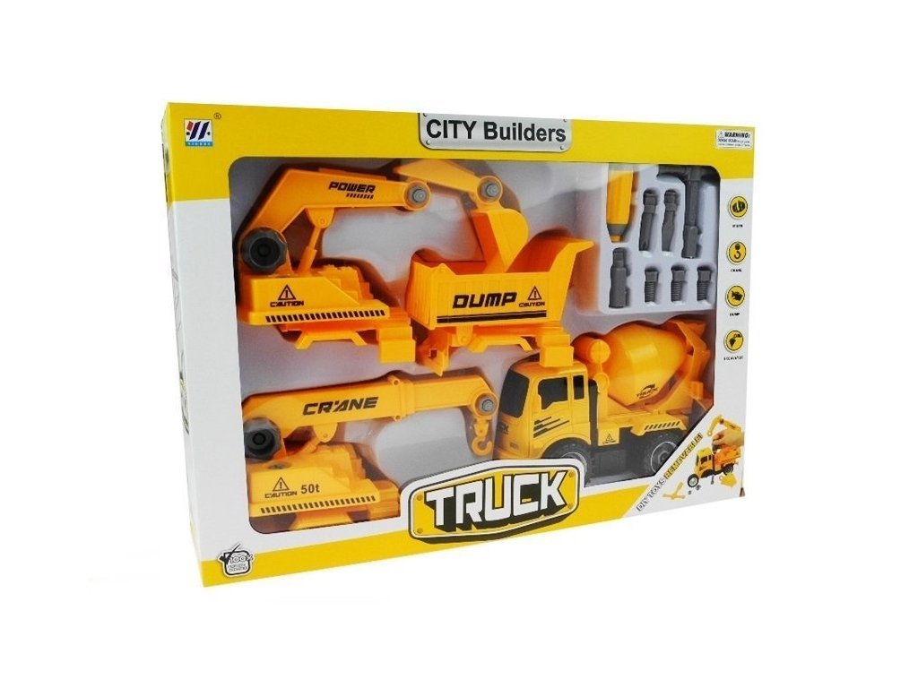 Sada vozidel pro malé kutily, která obsahuje: -betonová míchačka -sklápěčka -jeřáb -kopací stroj -Šroubovák s vyměnitelnými hroty pro šroubování Auto (v závislosti na zvoleném modelu) lze rozebrat na cca 6-7 částí