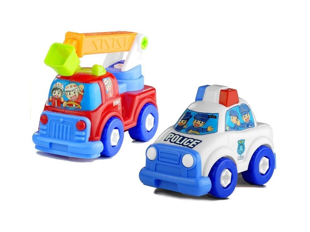 Sada vozidel Policie, hasiči, odtahovka, rozebíratelná Prezentovaná sada se skládá z vozidel – policejního a hasičského.