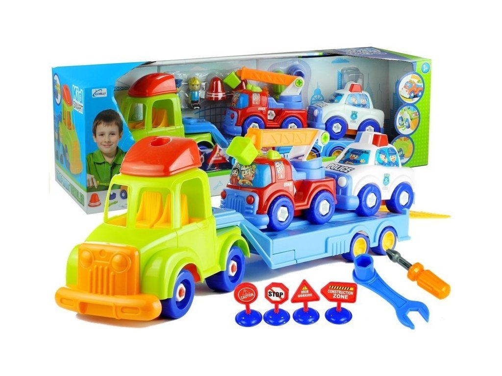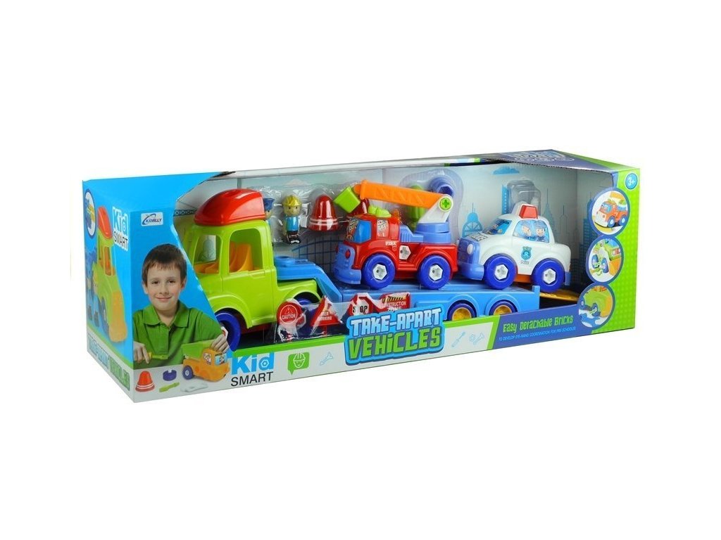 Sada vozidel Policie, hasiči, odtahovka, rozebíratelná Prezentovaná sada se skládá z vozidel policejního a hasičského