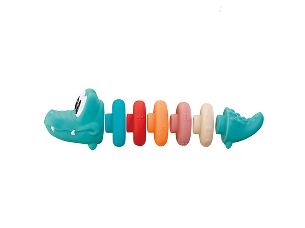 - Hlavním prvkem setu je roztomilá pyramida s krokodýlem, která nejen povzbuzuje dítě ke hře, ale také zdokonaluje jeho motorické schopnosti skládáním kroužků různých velikostí a zajímavých vzorů