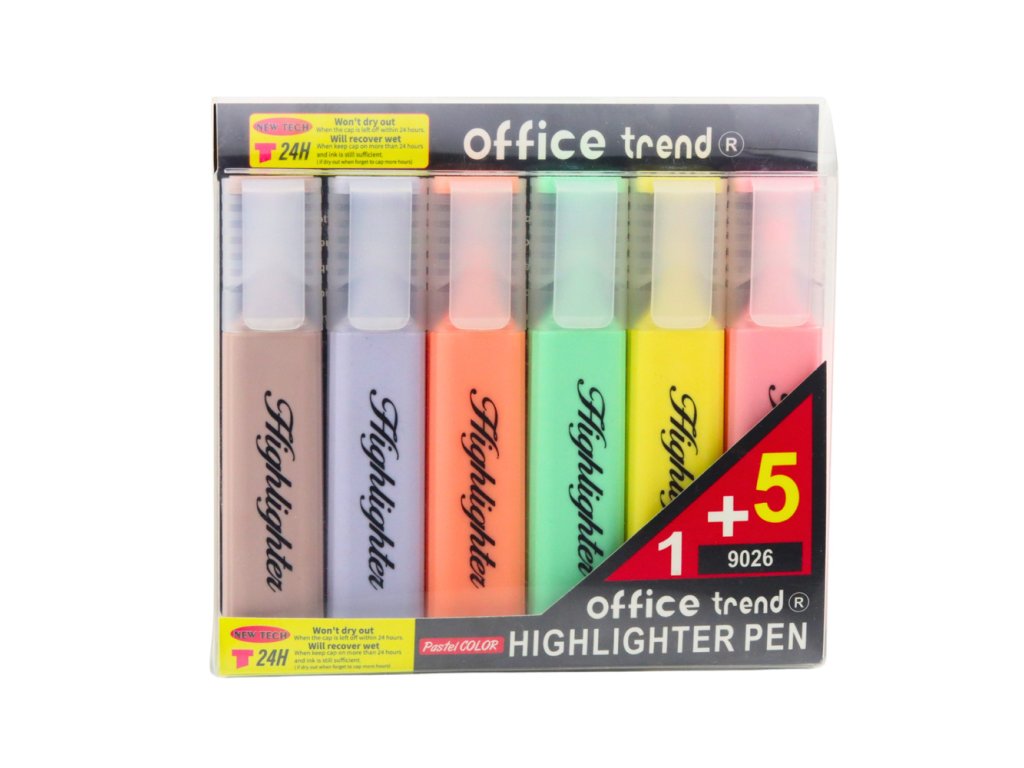Sada Zvýrazňovačů Pastelové Barvy Na Poznámky 6 ks je vynikající volbou jak pro kancelář, tak pro školu Díky jemným, pastelovým barvám zvýrazňovače dodávají každé poznámce a dokumentu jedinečný charakter a v subtilním, elegantním stylu podtrhují nejdůležitější informace