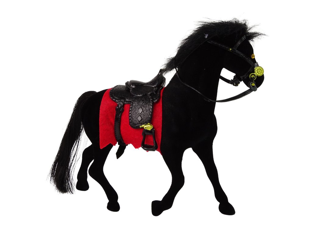 Sametová figurka Černý kůň s červeným sedlem Sametová figurka je vyrobena z vysoce kvalitního materiálu příjemného na dotek.