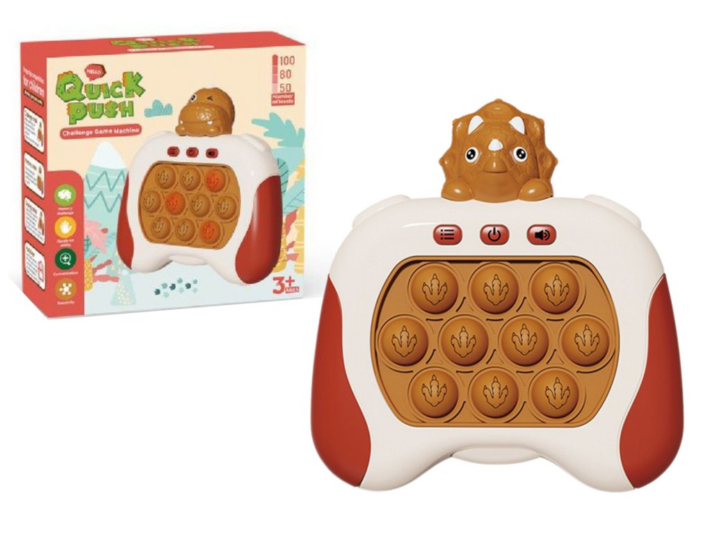 - Senzorická hra Triceratops Pop It na baterie Světla Zvuky Hnědá Konzole motivuje děti k zapamatování a opakování sekvencí světel
