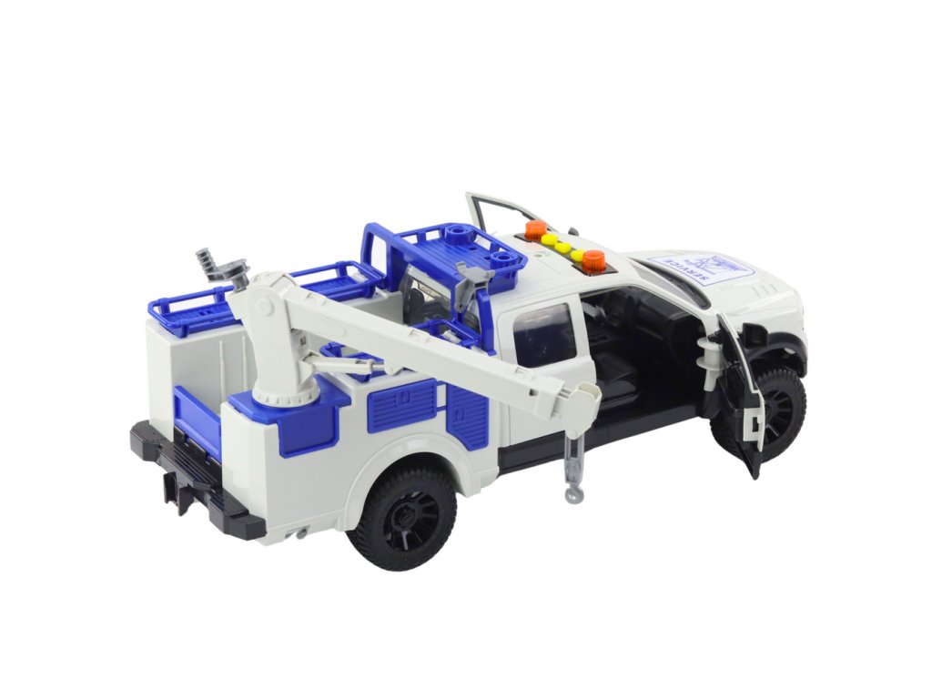 Servisní vozidlo s jeřábem bílý je realistická hračka pro děti, které fascinují specializovaná vozidla Bylo navrženo s důrazem na detail, a díky efektům světelným a zvukovým je hra ještě poutavější a realističtější