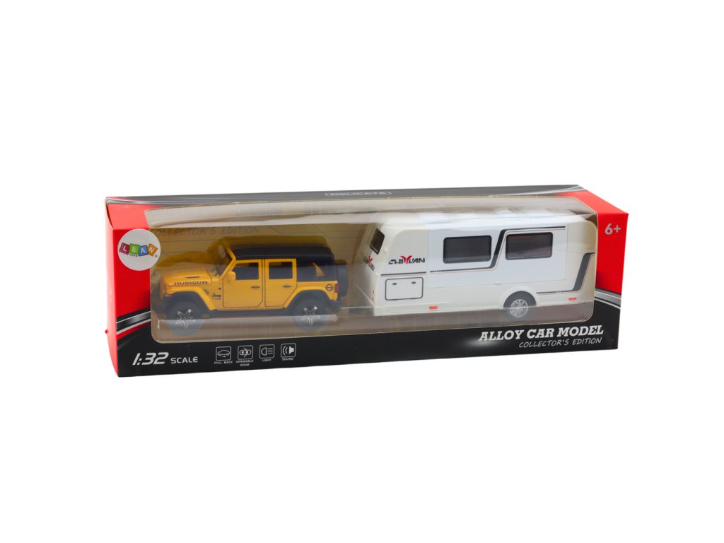 Auto terénní s karavanem žluté 1:32 je kovový model terénního vozidla s přívěsem, který je skvělou volbou pro všechny milovníky automobilů, cestování a realistických miniatur vozidel.
