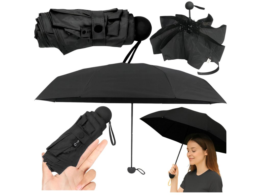 Objevte dokonalý doplněk pro každé počasí! Naše skládací parasolka s ochranou UV UPF 50+ je ideální volbou pro slunečné i deštivé dny. S průměrem 90 cm a v elegantní černé barvě se stane stylovým detailem vaší každodenní garderoby. Díky lehké a kompaktní konstrukci ji snadno uložíte do kabelky, batohu nebo dokonce do kapsy větší bundy. Vyrobená z odolného polyesteru, který je nejenom odolný vůči vlhkosti, ale také blokuje UV záření díky ochraně UPF 50+, poskytujíc tak ochranu vaší pokožce během horkých dnů. Kulovité držadlo zajišťuje pohodlný úchop a stabilní konstrukce umožňuje bezproblémové používání za každého počasí. Součástí balení je i ochranné etui, které chrání parasolku během přepravy a skladování.