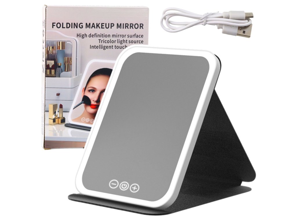 Skládací LED zrcátko o rozměrech 18,5 x 14,5 cm s trojbarevným osvětlením a nastavitelným jasem je elegantní a funkční řešení pro všechny, kdo ocení pohodlí a přesnost při každodenní péči nebo líčení.