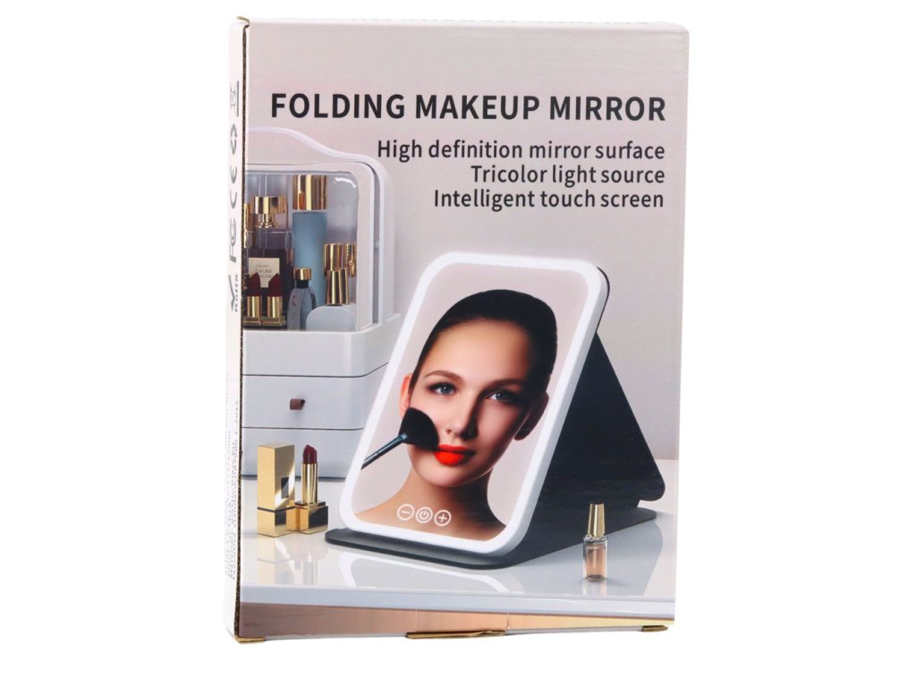 - Skládací LED zrcátko o rozměrech 18,5 x 14,5 cm s trojbarevným osvětlením a nastavitelným jasem je elegantní a funkční řešení pro všechny, kdo ocení pohodlí a přesnost při každodenní péči nebo líčení