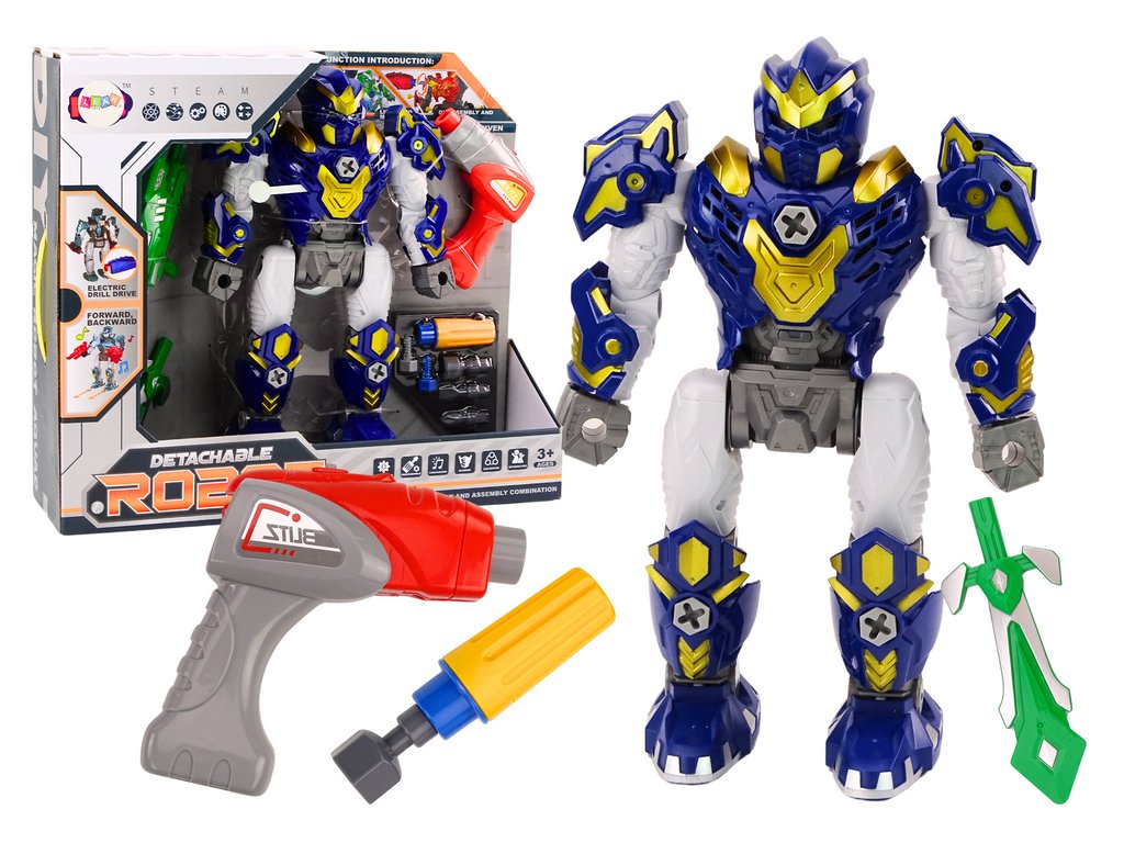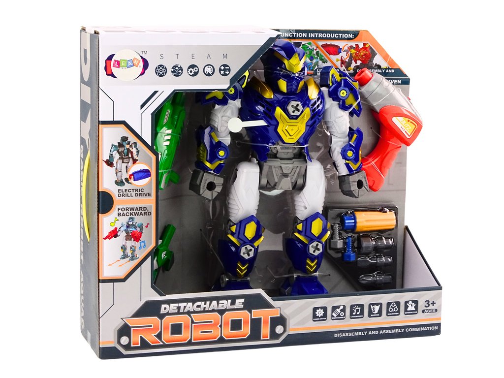 Robot je vybaven zbraní, vrtačkou, šroubovákem, světelnými a zvukovými efekty, což zajišťuje unikátní zábavu a rozptýlení Rozkládání a skládání robota: Díky vrtačce a šroubováku mohou děti zašroubovat a vyšroubovat části robota, rozvíjejíc tak manuální dovednosti a kreativitu