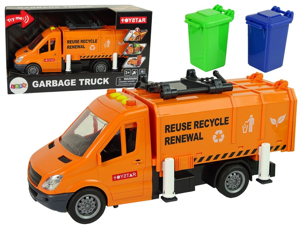 - Popelář s frikčním pohonem a zvukovými efekty, oranžový Popelářské auto je vozidlo, které děti často vídají na silnicích a které vzbuzuje jejich zájem